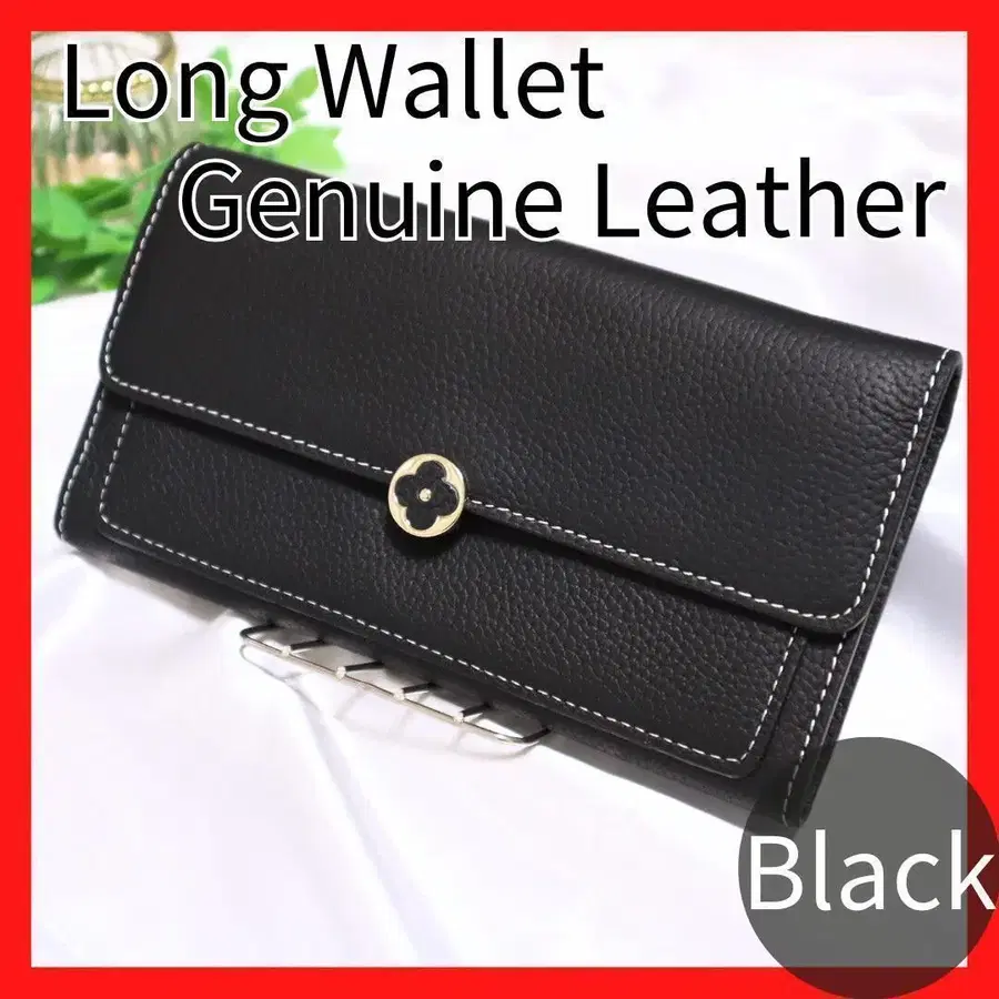 천연 가죽 장지갑 블랙 여성용 이단 접이 블랙 원 포인트가 세련된 꽃
