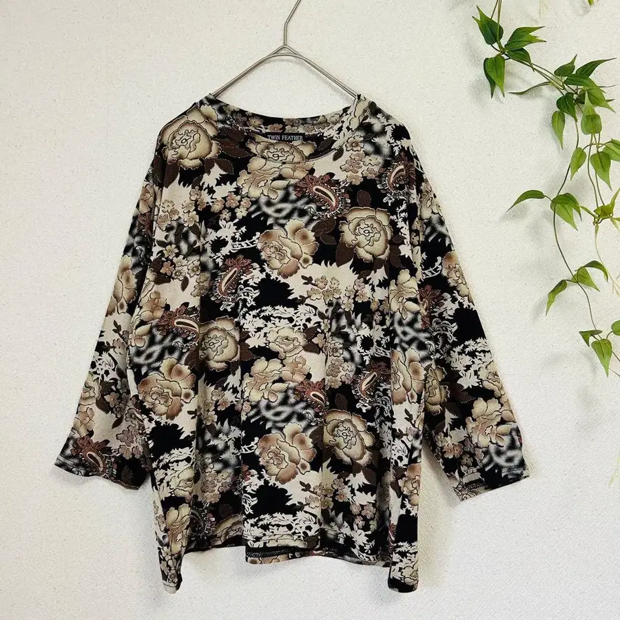 시선을 사로잡는 큰 장미 꽃들과 섬세한 페이즐리 무늬, 그리고 악센트로 레오파드 같은 원단 패턴이 조합된 매우 독특한 디자인의 의류입니다.