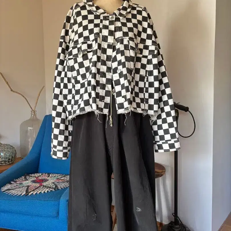 짧은 기장 넓은 폭 트래커 자켓 체크 무늬 깃발 TORO