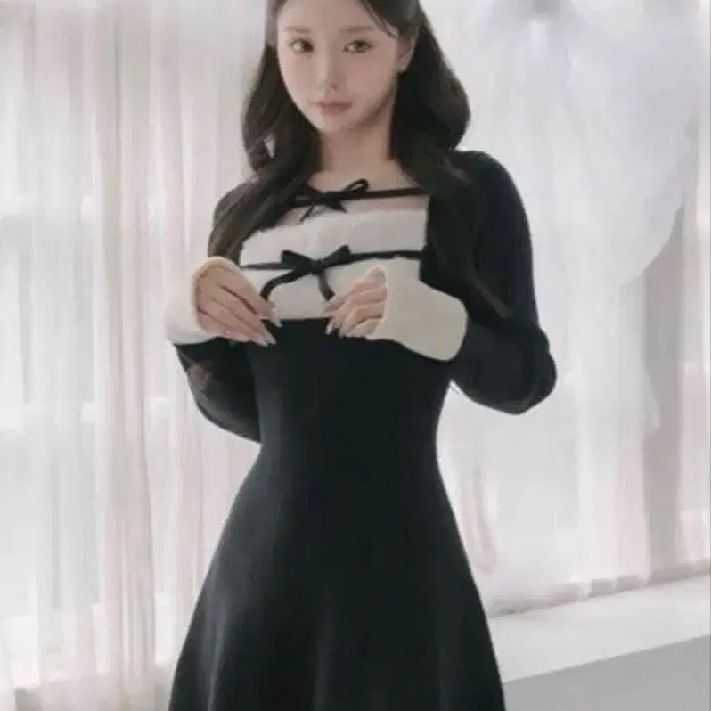 Darich 리본 퍼 플레어 니트 미니 원피스