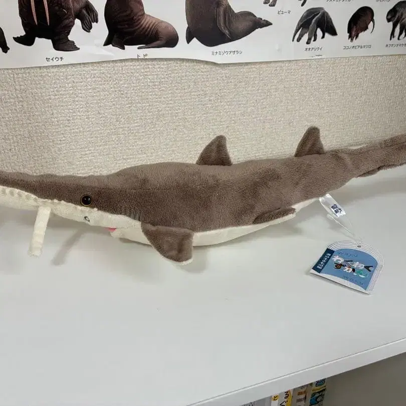 톱상어 봉제 인형입니다. 전체 길이 39cm. 택 포함입니다. 장식하지 않고 보관하고 있었기 때문에, 얼룩 등은 없습니다.