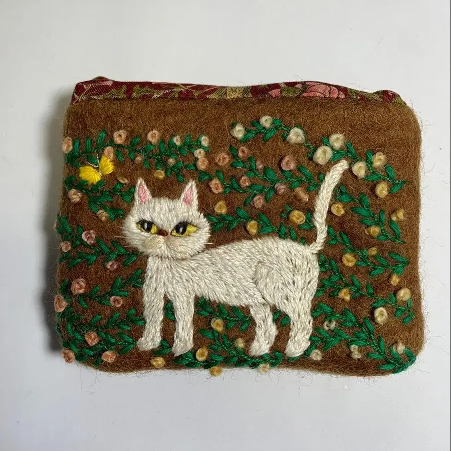 화이트 고양이와 노랑나비 양모 펠트 원단 파우치