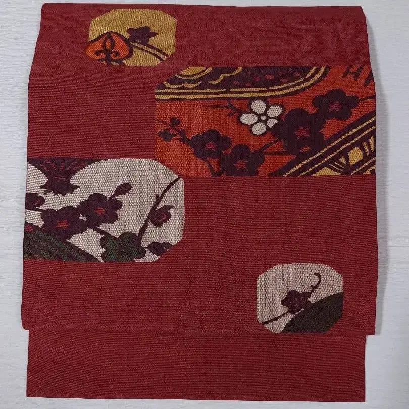 나고야 오비 순수 실크 빨간색 브라운 꽃무늬 기하학 패턴