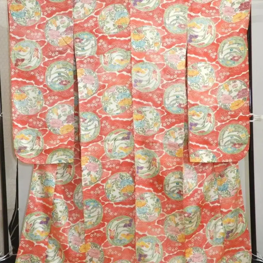 순수 실크 홍가타 후리소데 귀여운 후리소데 안료 손 인쇄