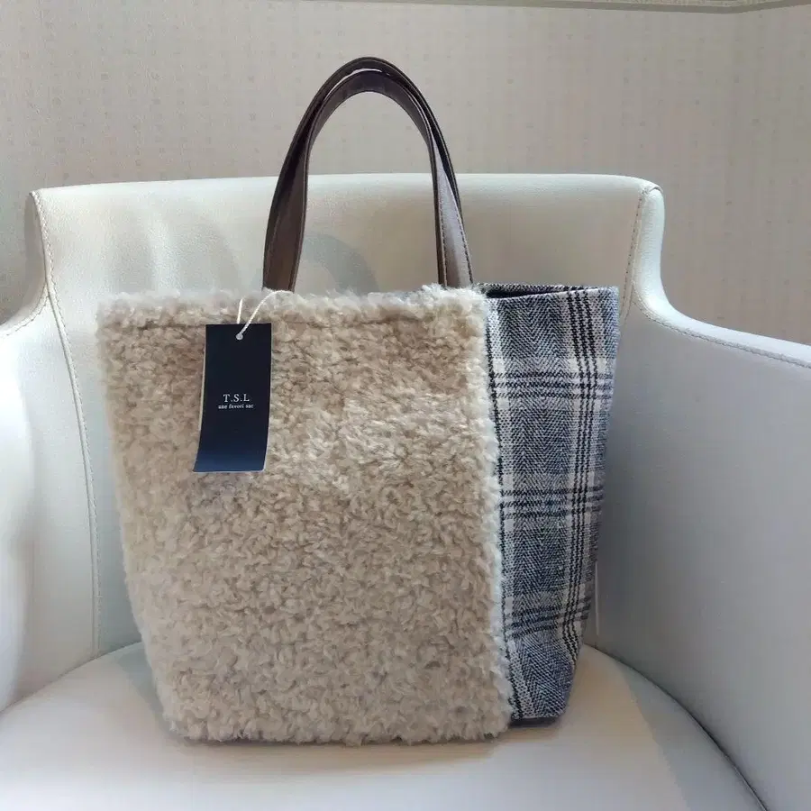 새상품 TSL 퍼 체크 무늬 토트백