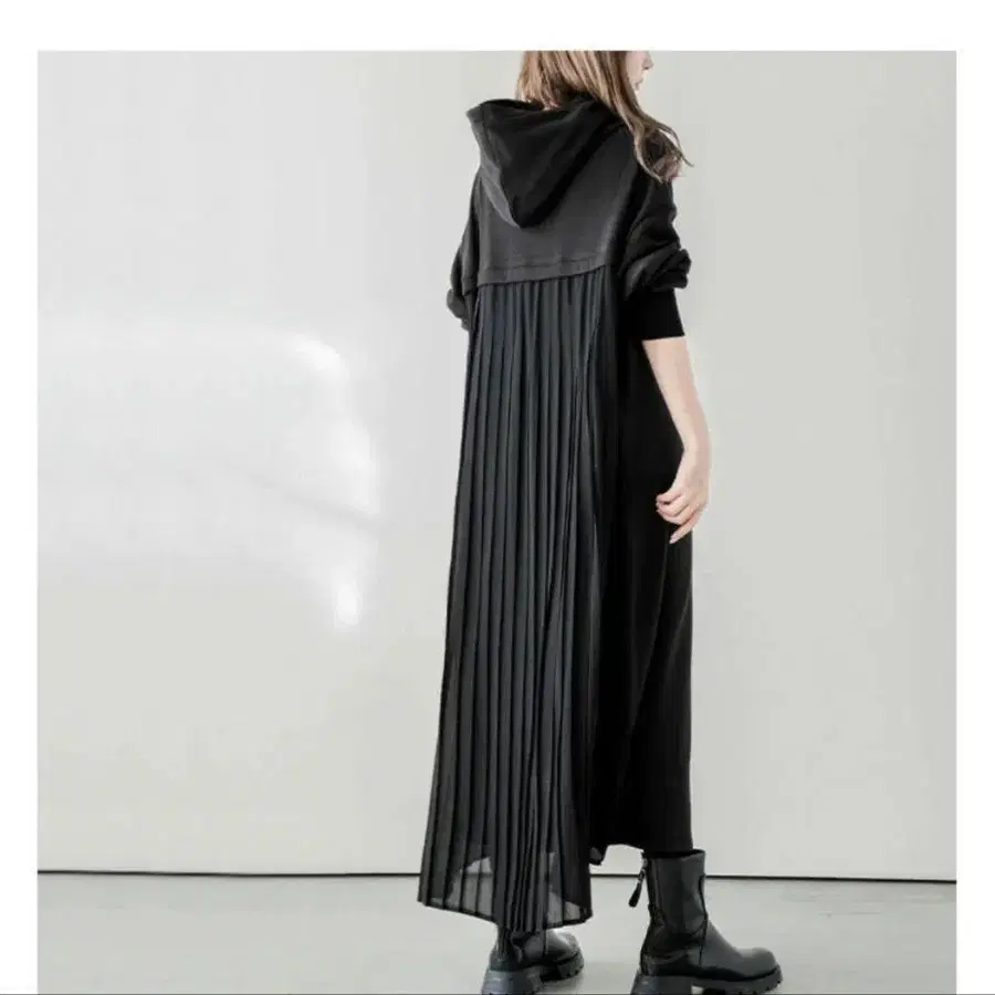 [미사용] 후드 부착 백 플리츠 롱 원피스 블랙