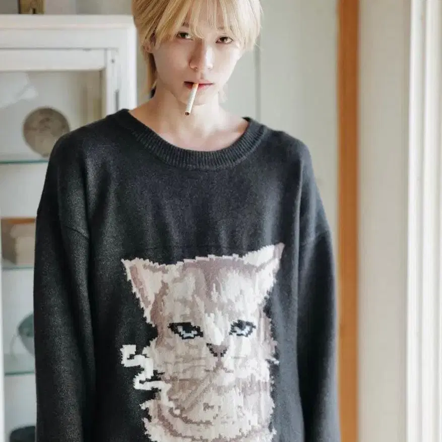 [ primura ] 고양이 자수 다크 그레이 스웨터