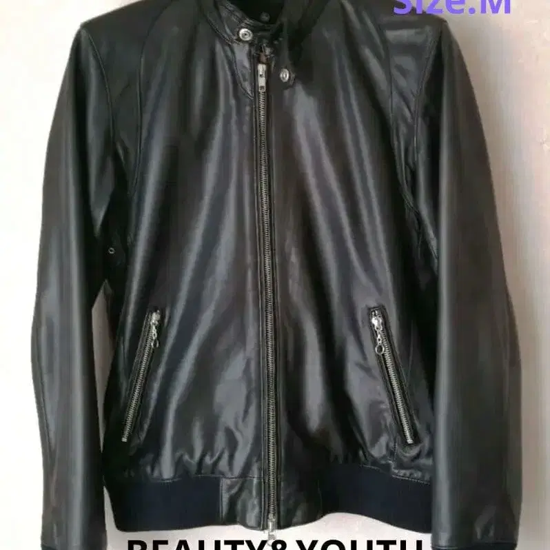 자동 번역되었어요. 원문보기블랙 가죽 싱글 라이더 자켓, 스탠드 카라와 리브 소매가 특징입니다.