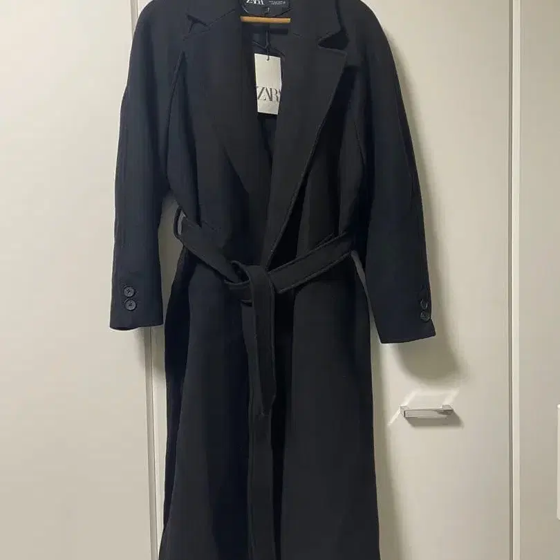 심플하고 세련된 디자인의 ZARA 롱 코트, 텍스처가 있는 블랙 원단, 벨트 포함으로 스타일리시합니다.
