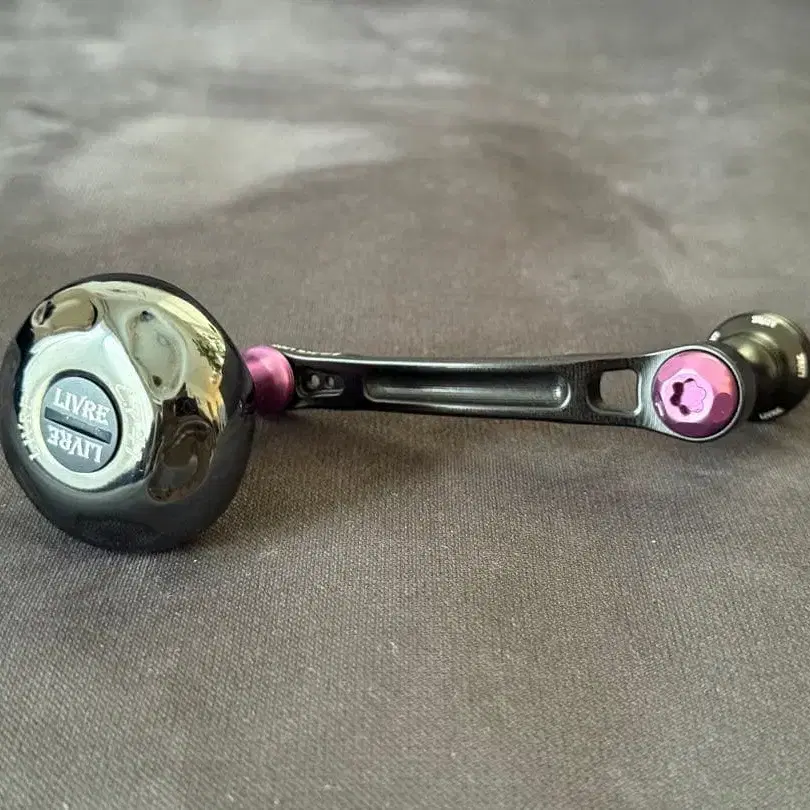 스피닝 릴용 핸들 LIVRE의 LightArm70은 스피닝 릴용 경량 핸들로, 스타일리시한 블랙과 퍼플 디자인이 특징입니다.