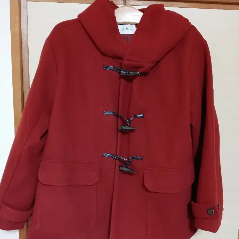 빨간색 더플 코트 후드 부착