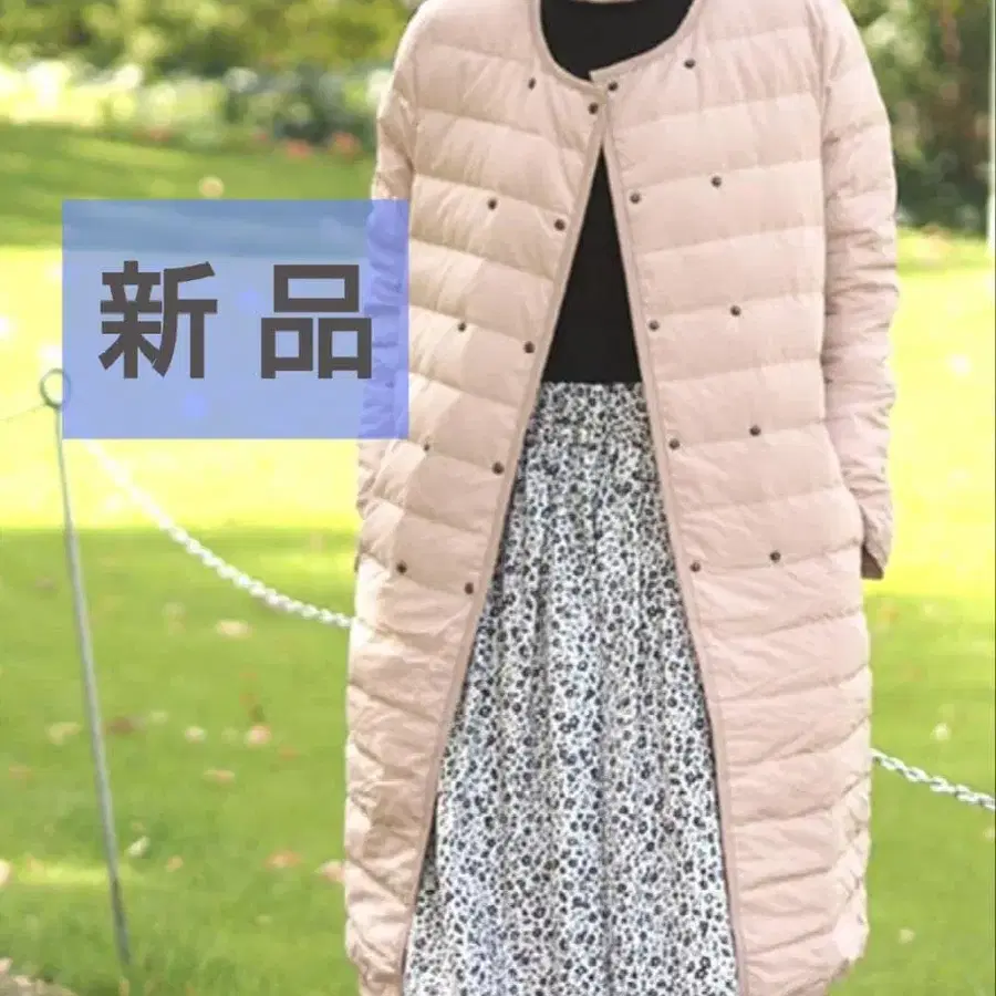 심플한 디자인의 베이지 롱 다운 자켓. 부해 보이지 않고 가을/겨울/봄에 활용 가능합니다.