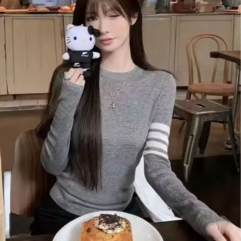인기! 당일 발송 스트라이프 소매 니트 상의 왕홍 그레이