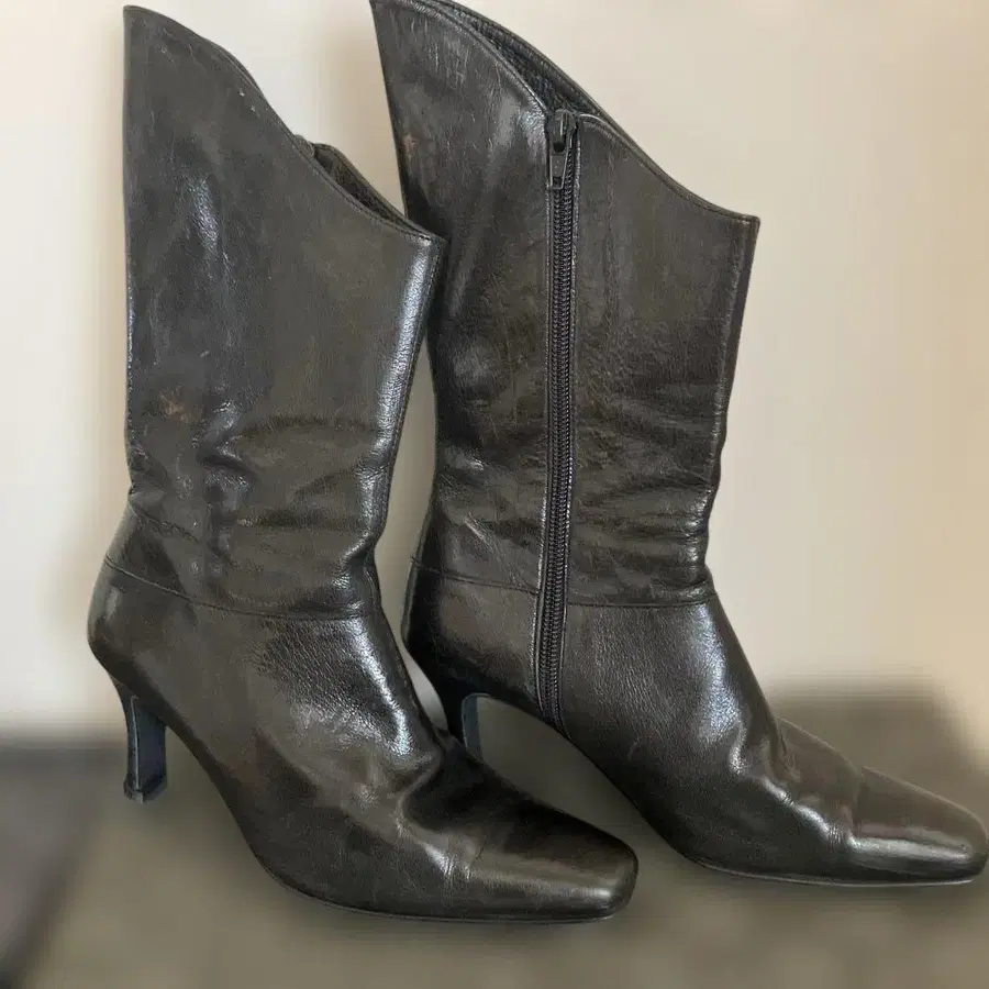 블랙 천연 가죽 하이힐 부츠