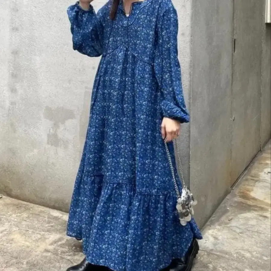 빈티지 플라워 무늬 파이핑 티어드 원피스