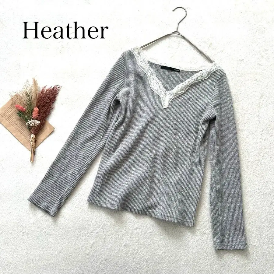 [헤더] F) V넥 리브 니트 레이스 이너 티셔츠 프릴 긴팔 니트