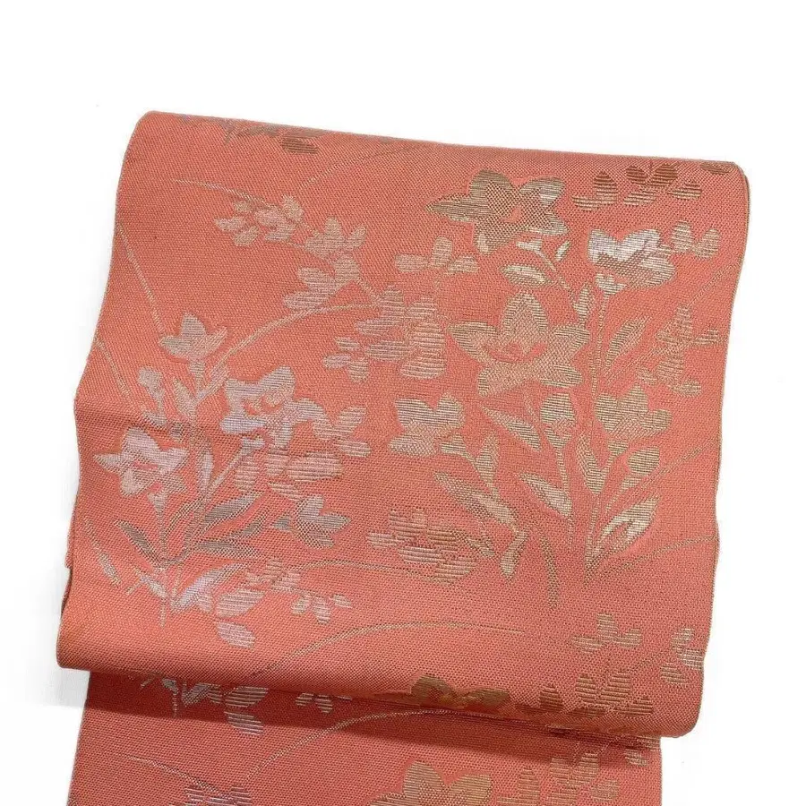 나고야 오비 명주 초롱꽃, 싸리꽃 무늬 핑크 기모노 081t