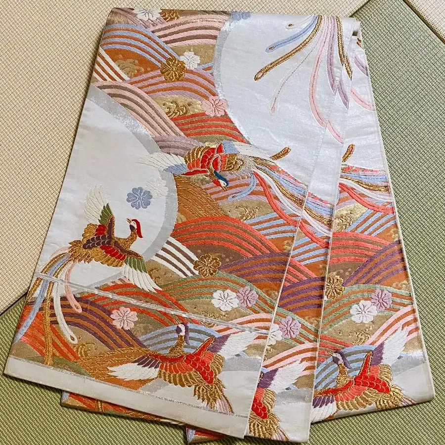 아름다운 다색 자수 후쿠로 오비 화이트 베이스 f035