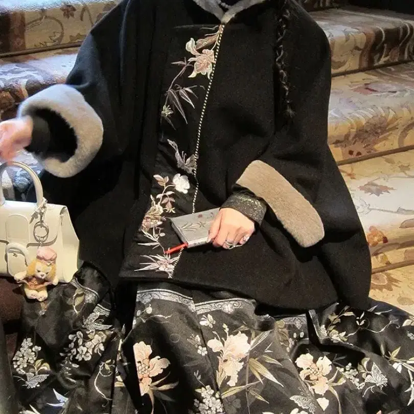 십삼여 잠금 비단 망토 엘레강트 꽃무늬 블랙 판초 M 사이즈