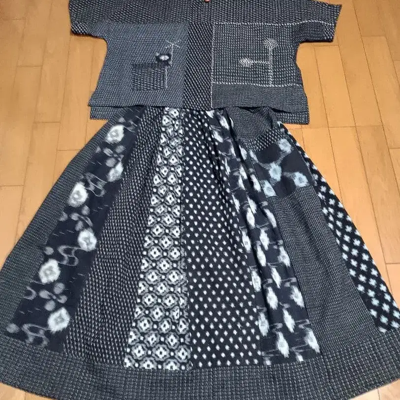 빈티지 원단 네이비 나염 쿠루메 가스리, 유킨코 등을 균형 있게 이어 붙여 스커트를 제작했습니다. 귀여운 셋업이 완성되었습니다.