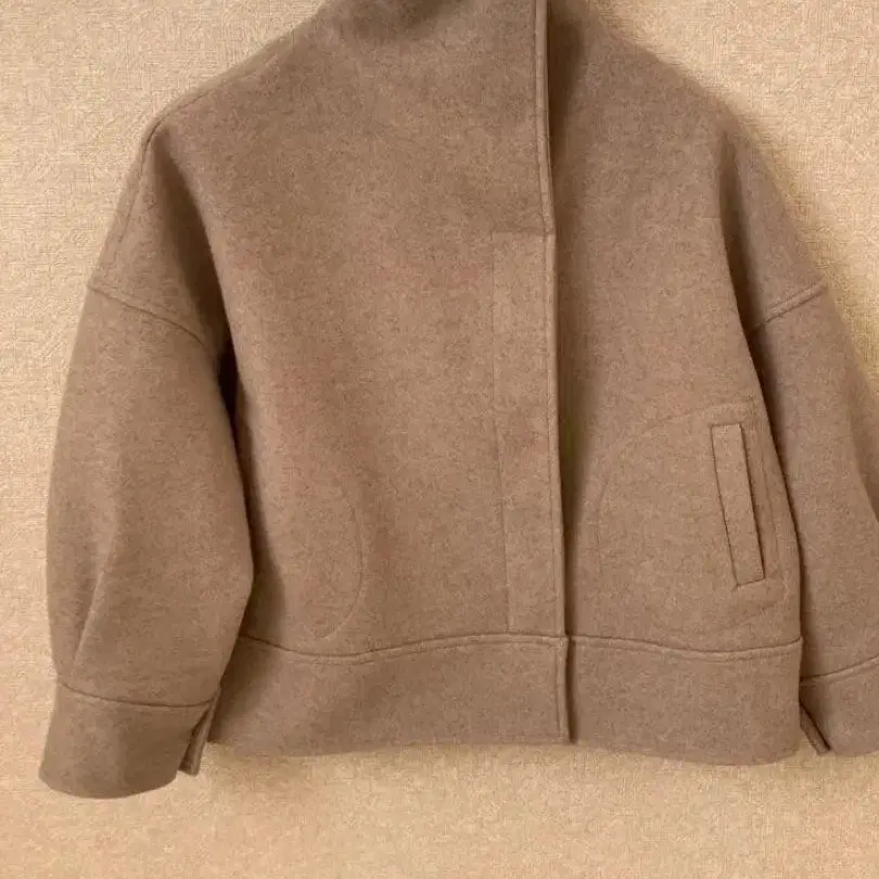 자동 번역되었어요. 원문보기울 혼방 소재의 베이지 하이넥 자켓, 캐주얼한 오버 사이즈 디자인.