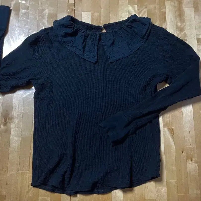 안에 받쳐 입고 니트나 맨투맨을 입어 옷깃의 프릴을 내는 것이 아주 귀여워요.