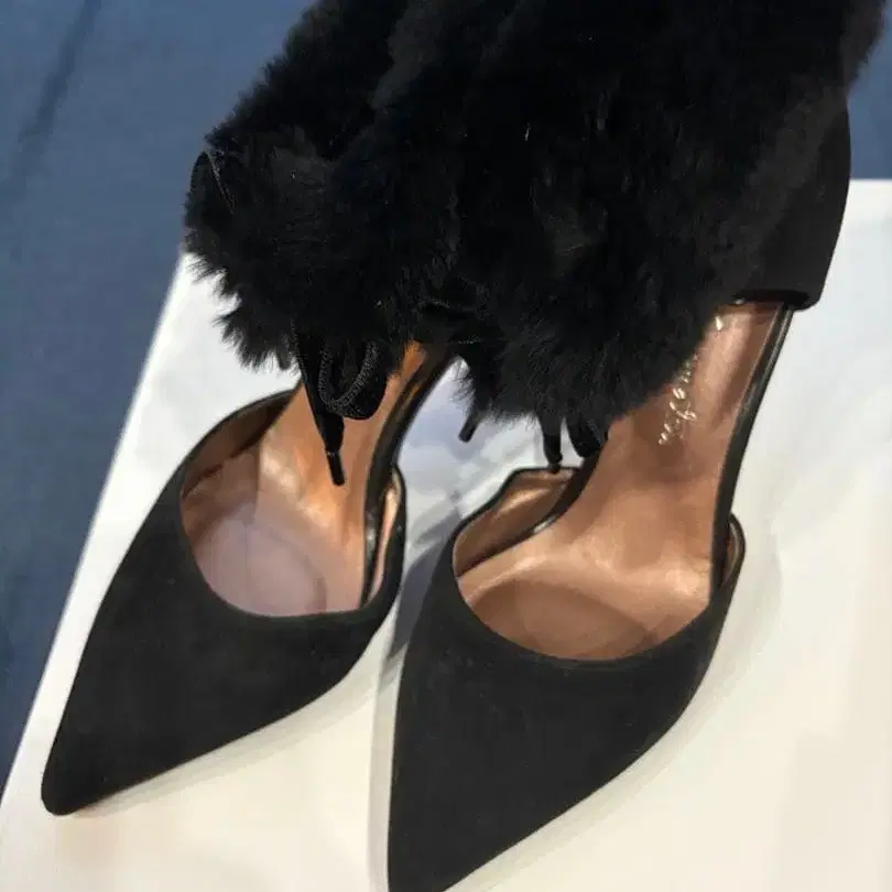 새상품급 중고 카네마츠 블랙 퍼 발목 스웨이드 펌프스 23