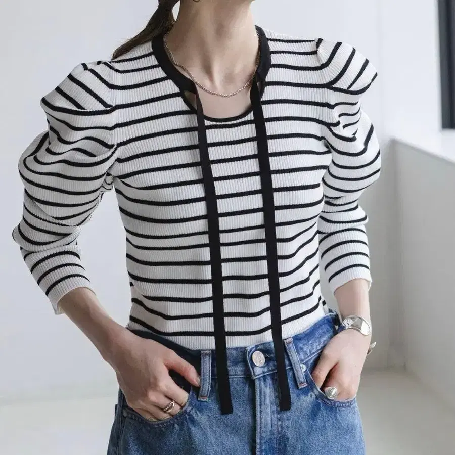 넥라인 부분의 니트 리본은 그대로 늘어뜨려 내추럴한 느낌을 주거나, 묶거나 교차시켜 뒤에서 묶어 초커처럼 연출하는 등 어레인지 폭이 넓어 만족스럽습니다.