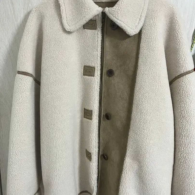 크림색 보아 자켓, 사이즈 38, 폴리에스테르 100%의 부드러운 소재이며, 안쪽에 작은 얼룩이 있습니다.