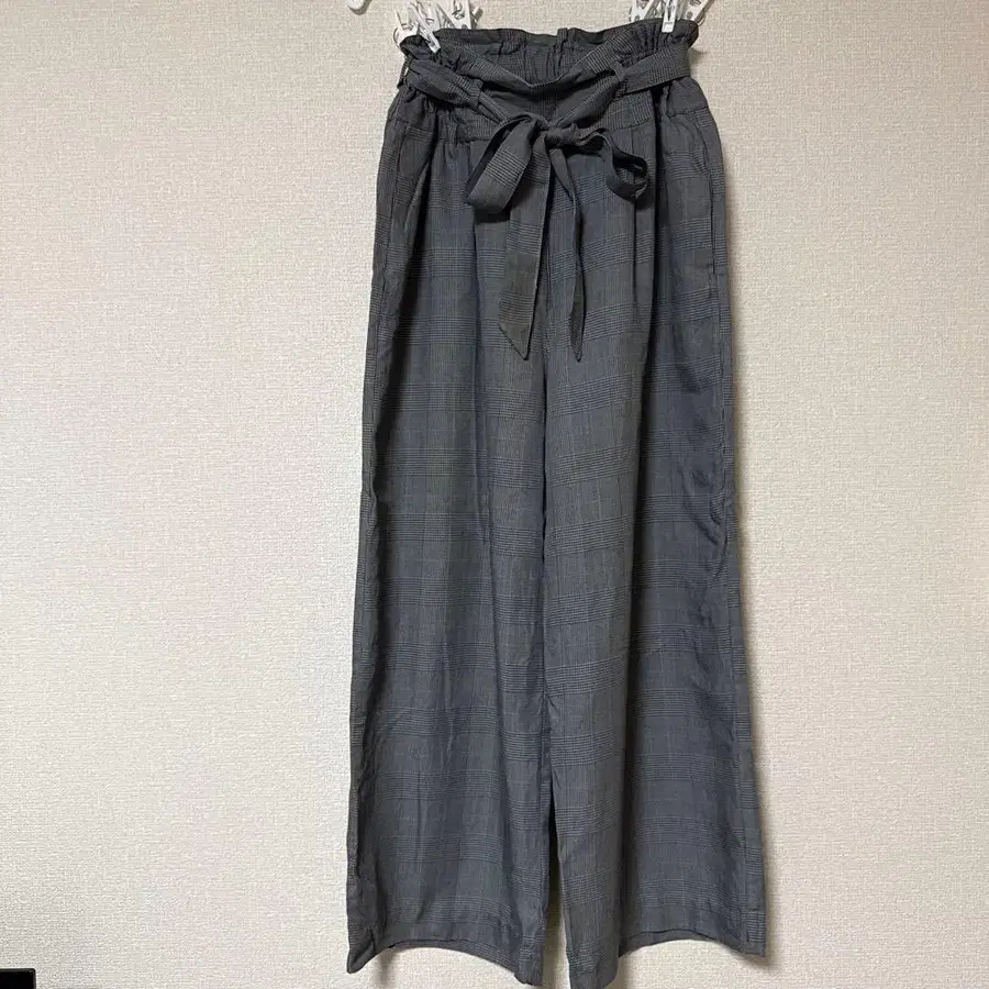 그레이 계열 체크 와이드 팬츠 허리 리본 포함