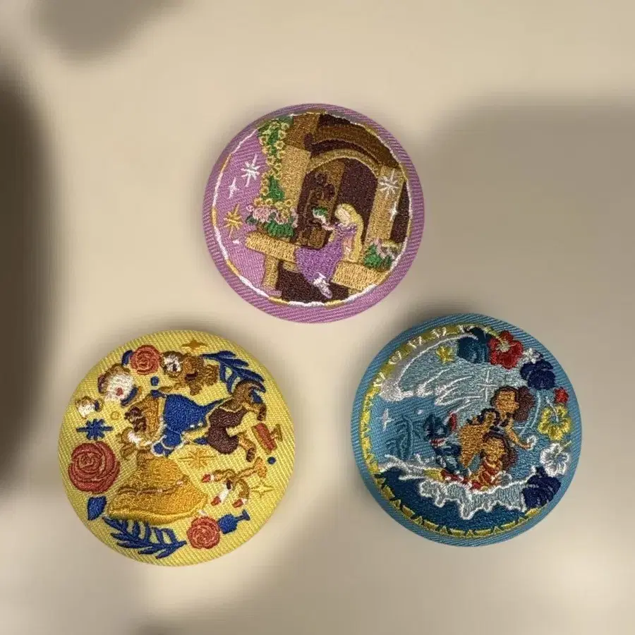 디즈니 캐릭터 자수 캔뱃지 3개 세트 모아나, 미녀와 야수, 라푼젤