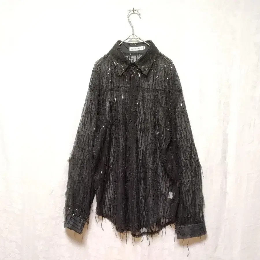 AEEWINNER 블랙 레이스 긴팔 셔츠 스팽글 프린지 M