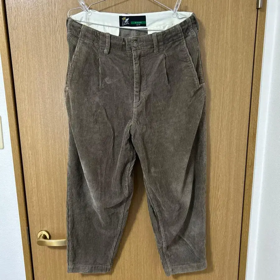 자동 번역되었어요. 원문보기코듀로이 소재의 브라운 팬츠, 스타일리시한 디자인.