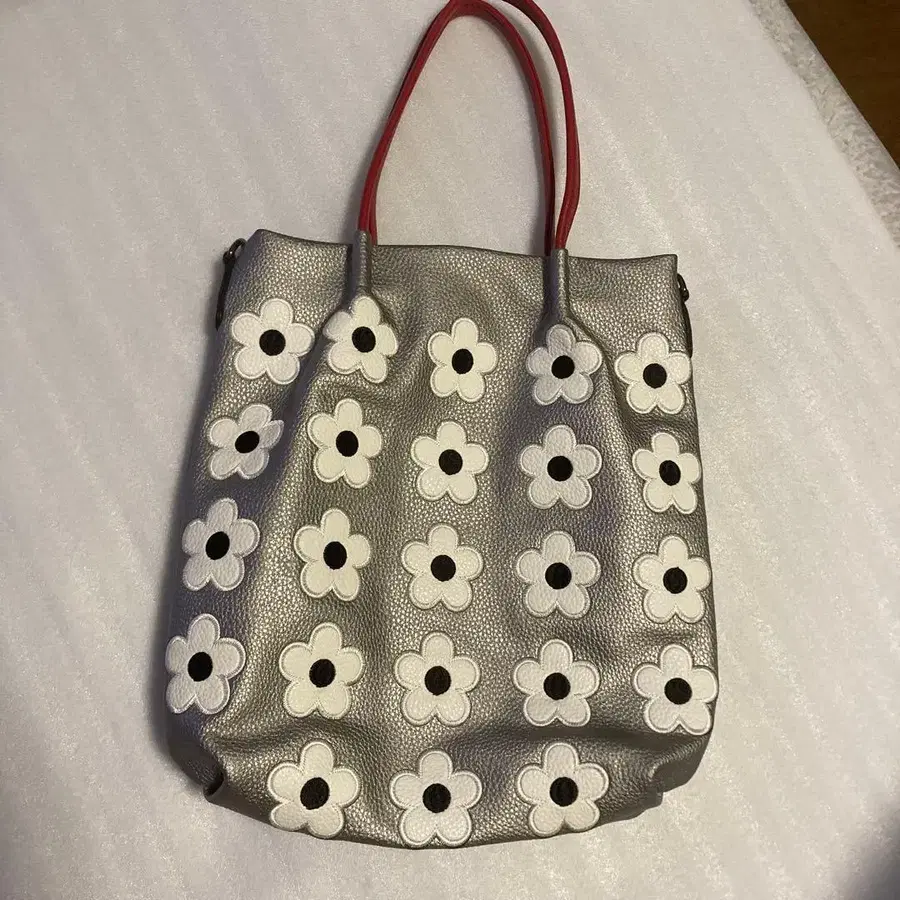 자동 번역되었어요. 원문보기실버 색상의 가죽 느낌 토트백입니다. 꽃무늬 디자인과 빨간색 핸들이 특징입니다.