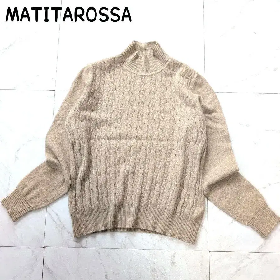 케이블 짜임 디자인의 베이지 하이넥 스웨터.