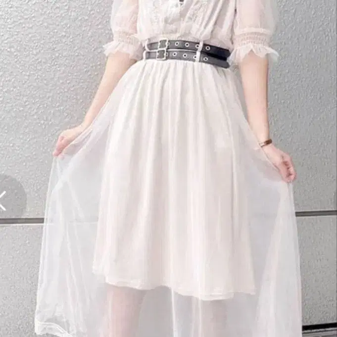 부드러운 소재감이 고급스러운 여성스러운 코디를 완성하며, 가죽 느낌의 벨트가 달콤한 분위기를 확실히 잡아줍니다.
