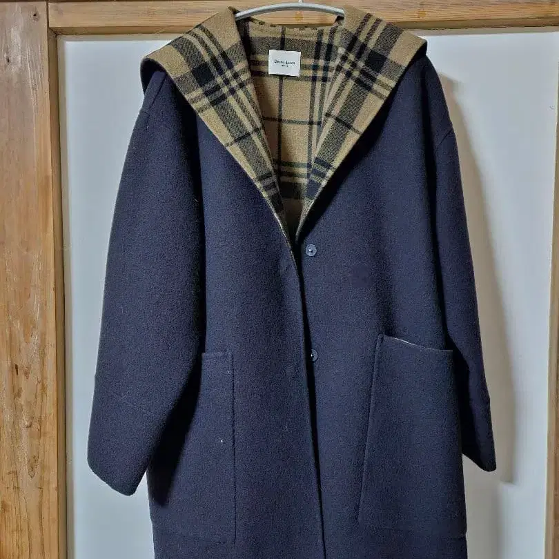네이비 후드 부착 울 코트