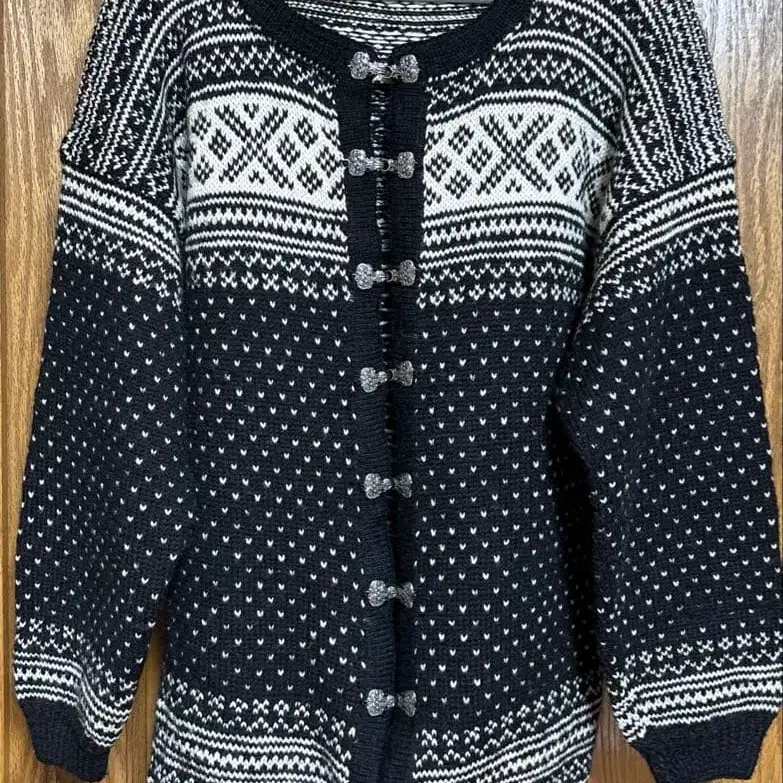 백랍 클래스 버튼 (은색 후크 버튼)이 특징인 북유럽 무늬 가디건입니다.