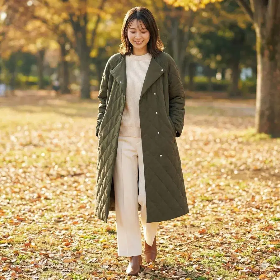 올리브 퀼팅 롱 코트