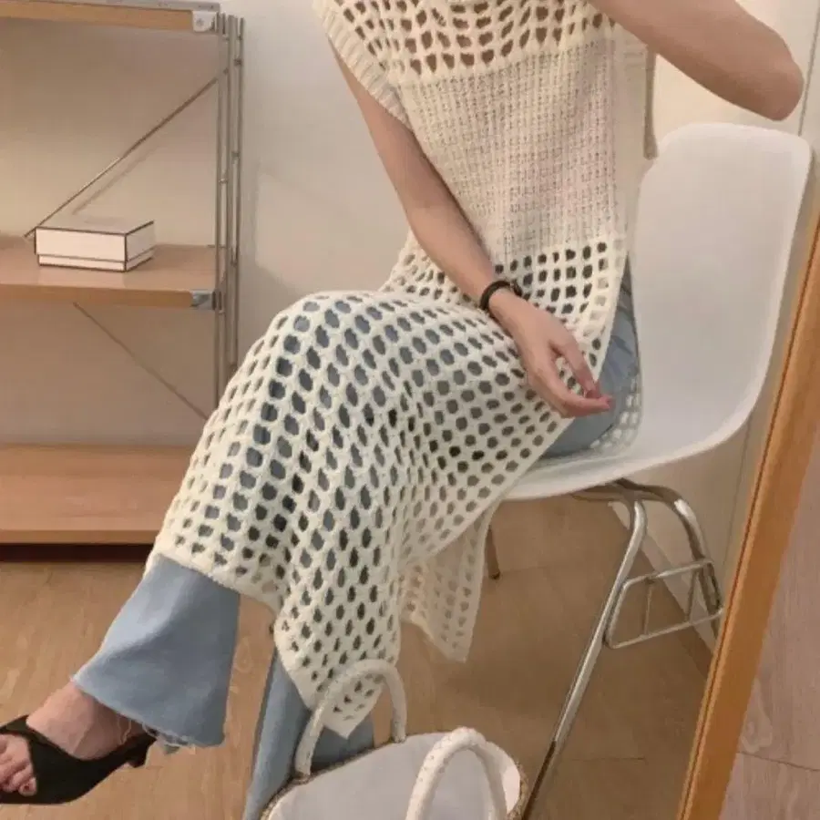 컬러 메쉬 시스루 니트 슬리브리스 베스트 원피스