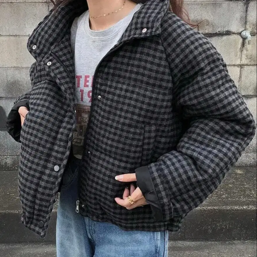 SHEIN FRIFUL 충전솜 다운 자켓 블랙 체크