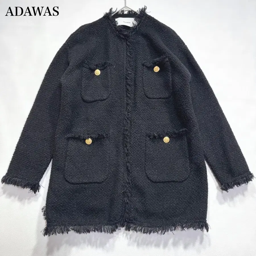 아다와스 니트 트위드 4 포켓 자켓 골드 버튼 노카라 블랙