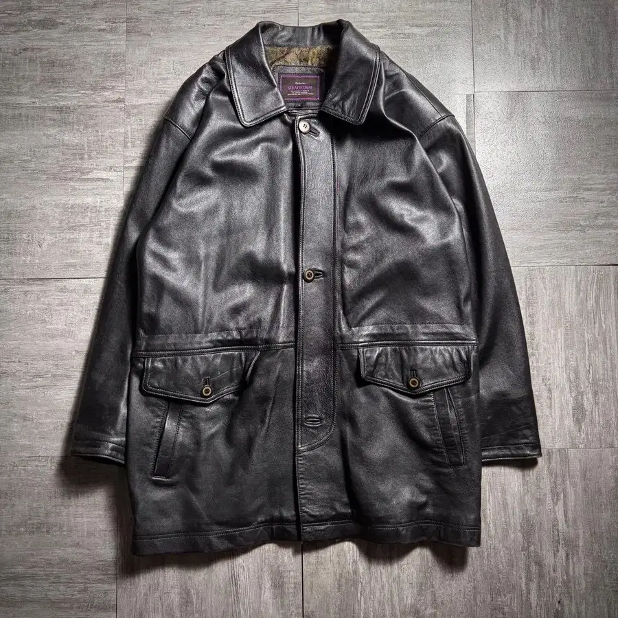 90년대 STRATHCONAR 제조, 고급 천연 가죽을 넉넉하게 사용한 빈티지 가죽 자켓입니다. 깊이 있는 블랙 색상의 가죽은 경년 변화로 인한 부드러운 질감과 적당한 광택을 내며, 입을수록 몸에 익숙해지는 평생템의 질감이 매력입니다. 프론트의 큰 플랩 포켓이나 허리를 쉐이프할 수 있는 듯한 절개 등, 코트와 같은 중후한 느낌의 디테일이 곳곳에 돋보입니다. 표기는 L 사이즈로 여유 있는 설계로, 후드티나 두꺼운 니트를 레이어드해도 아름다운 드레이프 실루엣을 유지합니다. 거친 워크 스타일부터 모드나 깔끔한 코디까지, 걸치기만 해도 압도적인 존재감을 발산하는 주역급 아이템입니다.