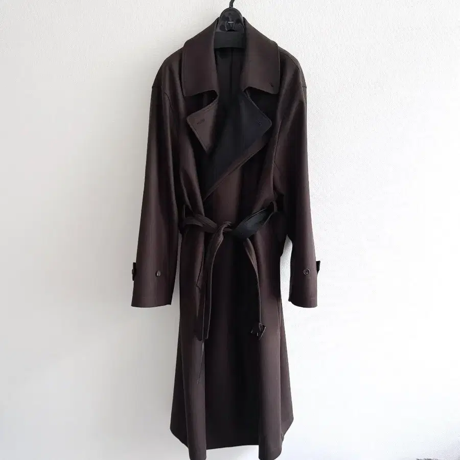 이중으로 겹쳐진 라펠이 특징인 더블 브레스티드 코트. 안쪽 라펠을 세웠을 때의 인상이 특징적입니다. 허리에는 가죽 끈이 박음질되어 있습니다.