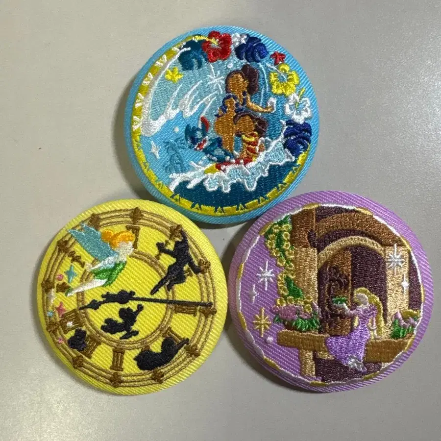 디즈니 자수 캔뱃지 3종 세트 라푼젤, 스티치, 피터팬