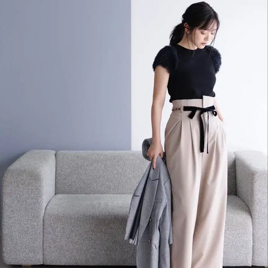 허리의 체인 벨트가 세련된 분위기를 연출하는 팬츠.