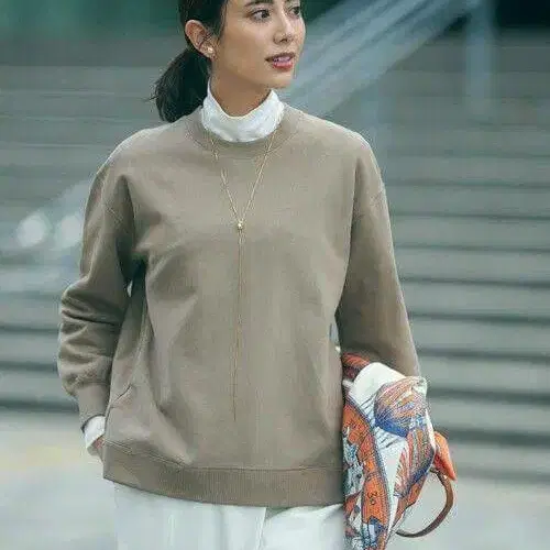 절묘한 실루엣의 고급 캐주얼 맨투맨입니다. 어깨선이 적당히 드롭되고, 몸통도 넉넉한 한 장입니다. 밑단은 리브 절개가 있지만, 밑단을 일부러 피트시키지 않고 자연스러운 A라인 실루엣으로 만들었습니다. 소매의 적당한 개더는 여성스러운 디자인 포인트입니다. 옆선에 슬릿 포켓이 달려 있어, 간단한 물건을 넣기에도 편리합니다. 뒷면 카라에 브랜드 로고 메탈 플레이트를 달아 오리지널 느낌을 더했습니다.