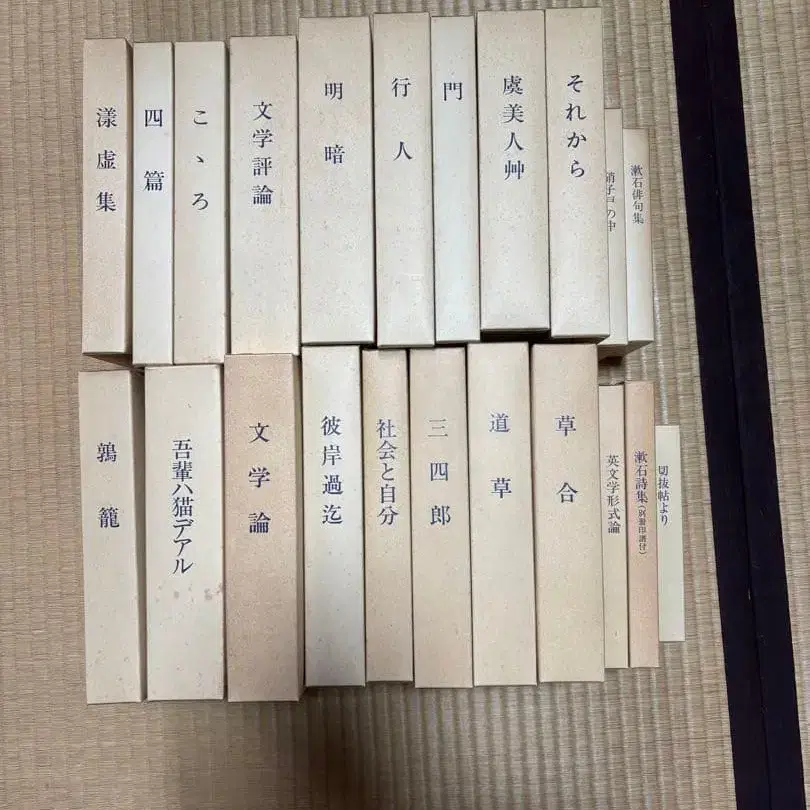 나쓰메 소세키 복각판입니다. [명저 복각]이라는 이름 그대로, 누구나 아는 작품들이 나열되어 있습니다. 전권 외부 박스가 포함되어 있으며 내용물의 상태는 좋습니다. 각 작품의 장정은 모두 다르며, 내부 상자가 천으로 되어 있거나 소구(책의 가장자리)가 금박풍 등 각 작품의 개성이 드러납니다. 전권 중 [목)・록 (별책 해설 번역문 포함)]이 빠져 있습니다. 집에서 떨어진 곳에 보관하고 있으므로 금요일까지 구매하신 경우 일요일까지 발송합니다. 그 외의 경우에는 최대 1주일이 소요되므로, 부디 잘 부탁드립니다. [사이즈] 1권당 약 10x17cm ~ 15x26cm [상태] 보관: 책장에 장식되어 있었으며 세월이 흘렀습니다. 외부 박스: 노후화에 따른 스크래치, 그을림, 얼룩 등이 있습니다. 내부 책: 내용물의 상태는 좋습니다. (참고로 [마음]의 내부 책을 올려둡니다.) [구매 시기] 추정 1981년경, 새 상품으로 구매. [내용] 저자: 나쓰메 소세키 명저 복각 소세키 문학관 [나는 고양이로소이다] [양허집] [메추라기 우리] [문학론] [우미인초] [초합] [문학평론] [삼사랑] [그 후] [사편] [문] [절필첩] [저편까지] [사회와 자신] [행인] [마음] [유리창 안] [길모퉁이] [명암] [소세키 하이쿠집] [소세키 시집(별책 인보 포함)] [영문학 형식론]