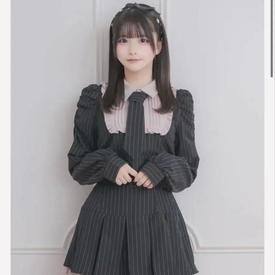 pium 넥타이 스퀘어 프릴 긴팔 상의 & 스커트 블랙 스트라이프