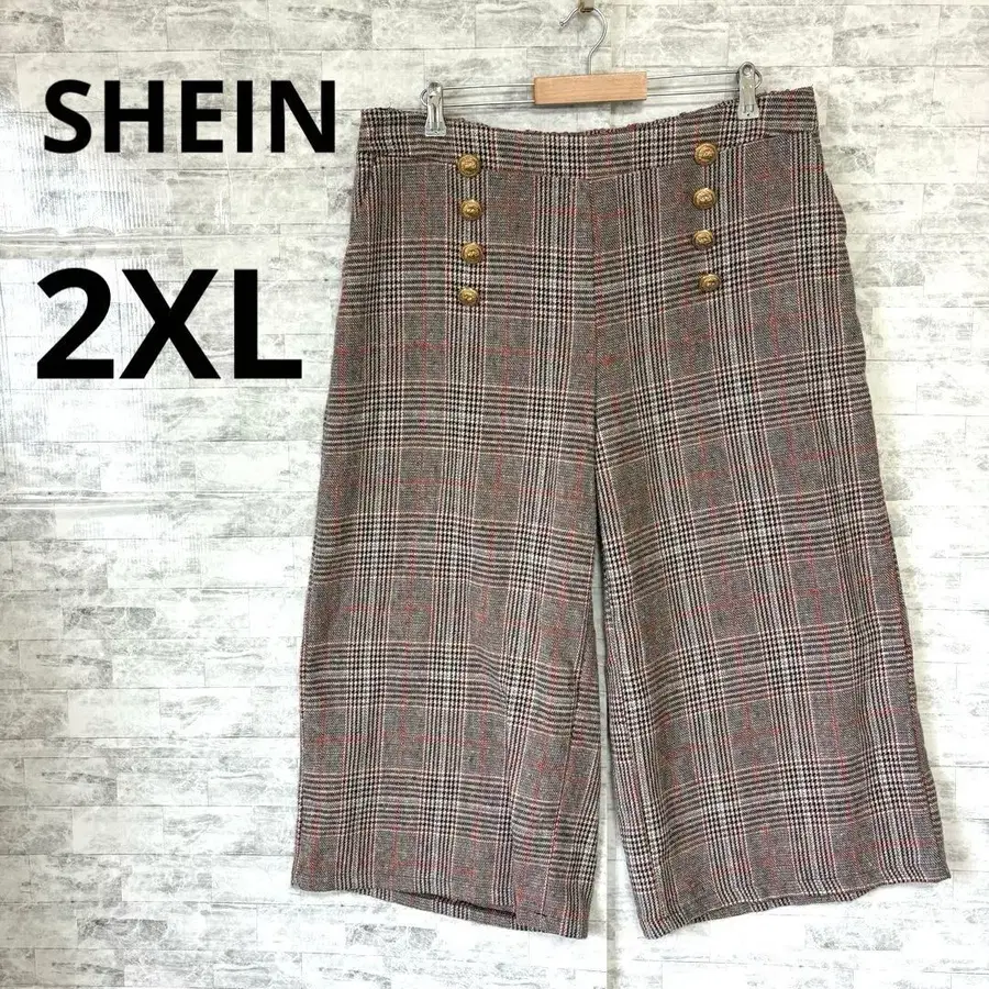 체크 무늬 와이드 팬츠, 골드 컬러 장식 버튼 포함. 빅 사이즈